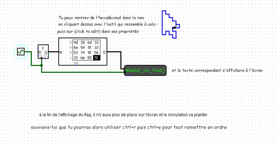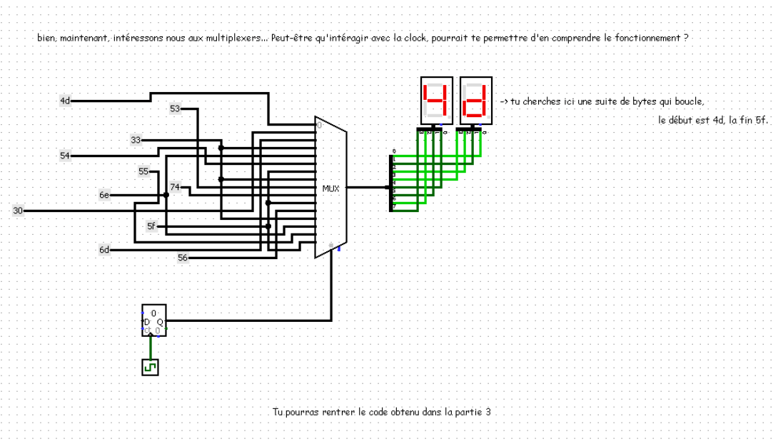 The second part introduces us to a multiplexer (an electronic component that allows us to choose between several inputs). By clicking on the clock a number of times long enough to loop, we obtain the following code: 4d 30 6d 33 6e 54 5f 33 53 74 5f 56 33 6e 55 5f: