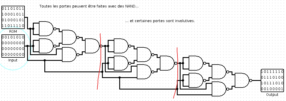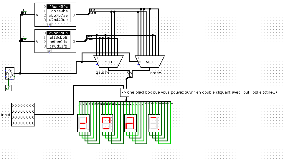 In this challenge, we have a Logisim file consisting of a main module and a blackbox. The operation is quite simple: we have a counter that selects an input for 2 multiplexers, which generate a 16-bit output each. The two outputs are concatenated into a 32-bit number, itself encrypted by the blackbox before being displayed on 4 7-segment displays.