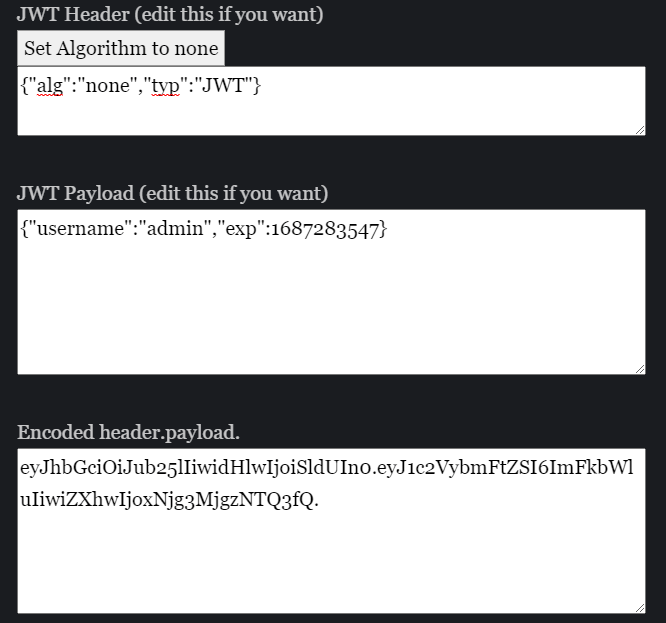 This token is encoding my username and an expiration date. Given the hint we have received earlier about the admin account, the natural course of action would be to forge an JWT containing {"username": "admin"}. In general this is not possible because JWTs are cryptographically signed, but maybe the web developer skipped the security section of when implementing JWT into his server. Let’s try the oldest trick in the book, in header when change the signature algorithm to “none”, effectively disabling the validy check of the token.